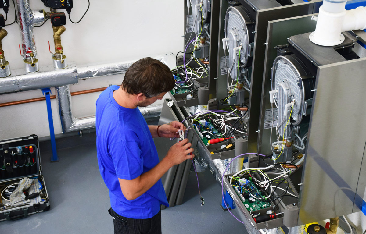Использование нескольких котлов также обеспечивает преимущество в том, что они взаимозаменяемы, тем самым в случае неисправности система в целом сохраняет работоспособность с временным уменьшением максимальной мощности. Неисправность будет очень быстро обнаружена благодаря системе диагностики, и жильцы многоквартирного дома могут даже не зарегистрировать неисправность, потому что котел можно отремонтировать во время работы.