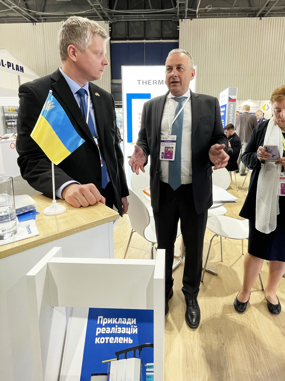 Своїм баченням процесу відновлення України під час відвідин нашого стенду поділився Міністр промисловості та торгівлі Йозеф Сікела. Україна - це найбільший у світі будівельний майданчик, де є великі перспективи для нашої компанії-виробника газових та електричних котлів та каскадних котелень.