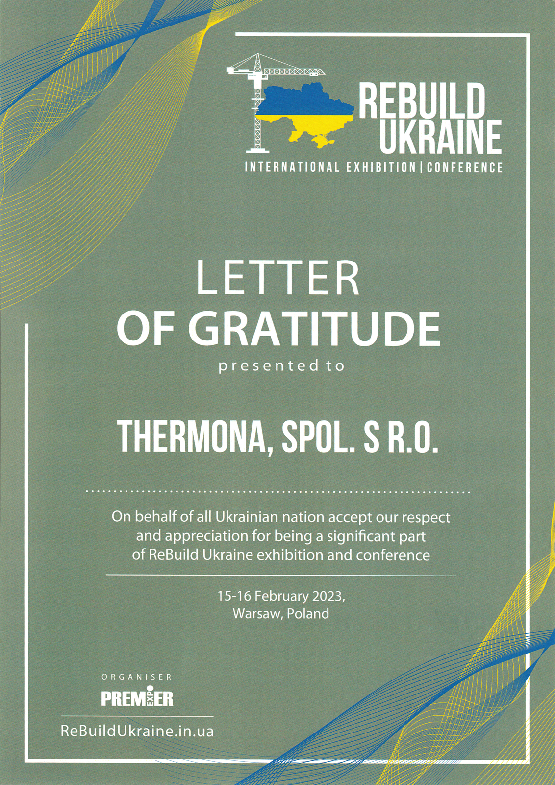 З 15.2. по 16.2.2023 у Виставковому центрі EXPO XXI Warszawa проходив Міжнародний форум REBUILD UKRAINE 2023. Делегація компанії THERMONA взяла участь у цьому заході під егідою Міністерства промисловості та торгівлі Чеської Республіки на офіційному чеському стенді.